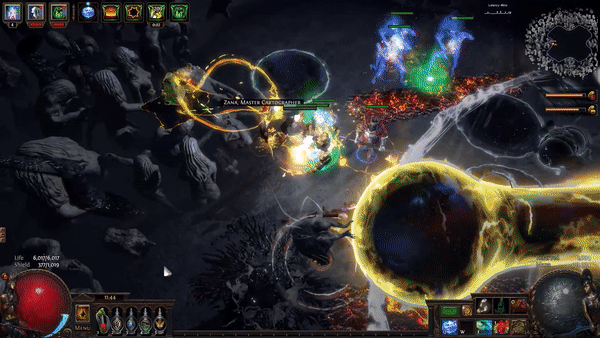 액트 7, Maligaro's Sanctum(말리가로의 지성소)에서 Wide-eyed Assemblage(휘둥그런 눈의 집합체)라는, 전기 구체 같은걸 날리는 몹이 있습니다. 여기에 4-5링크 정도 연결해주면 이제 본체의 딜링을 넘어서게 됩니다.