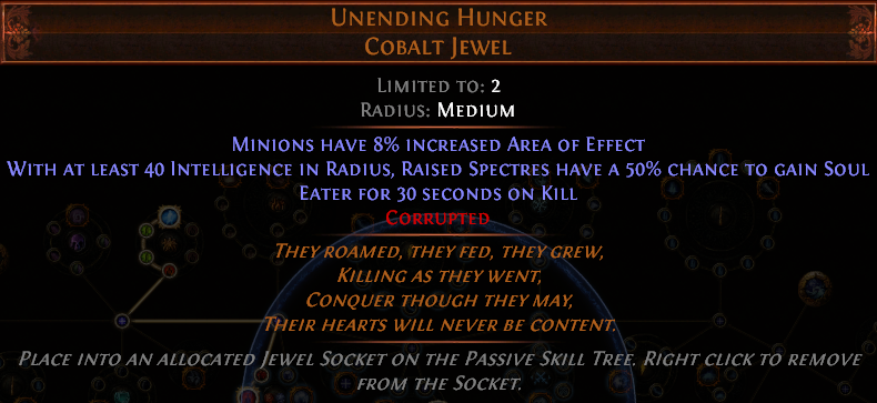 스펙터가 처치 시 50% 확률로 Attack/Cast Speed를 스택당 5% 늘려주는 Soul Eater 버프를 줍니다. 두 개까지 끼워도 상관은 없습니다만, 확률이 높아서인지 하나만 끼는 경우가 많습니다. poe.ninja에서는, Unending Hunger 착용 네크로맨서 상위랭커 20명 중 19명이 1개만 착용했습니다.