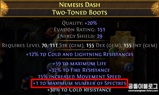 Bones of Ullr도 스펙터 숫자를 늘려줍니다만, 렙제가 낮아 방어 스펙이 매우 부실합니다. 나중에 스펙터+1에 생명력-레지 등이 적절히 붙은 신발을 구매합니다. 이속 30까지 달린 걸 구매하면 매우 좋겠지만 좀 비싸니까, 이속 없고 크래프팅 안 된 거에 이속 20-24 크래프팅을 붙여주는 것도 좋은 선택지입니다.
