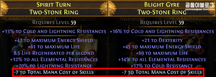 (Craft, Prefix) (-7~-6) to Total Mana Cost of Skills, 반지 2개 중 최소 1개는 -7이어야 함
