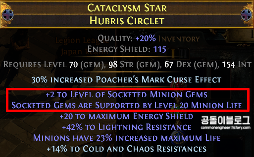 미니언의 데미지를 높이고 스펙터 최대 숫자를 늘려주는 유니크 방어구입니다. 페널티로 미니언 생명력 20% 감소가 있는데, 합연산이라 크게 부담되는 수준은 아닙니다.